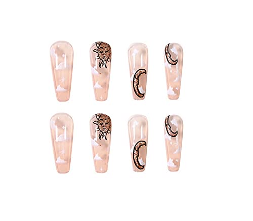 Stampa Francese Sulle Unghie,Unghie Finte Lunghe Lucide a Forma di Bara,Stampa a Copertura Totale Sulle Unghie Finte in Acrilico 24 Pezzi,Sole e Luna