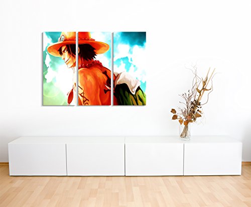 Stampa su tela in 3 parti, motivo Ace di One Piece, 3 x 90 x 40 cm (totale 120 x 90 cm), su telaio