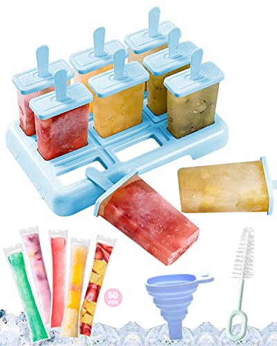 Stampi per Ghiaccioli, Formine Ghiaccioli Riutilizzabili 9 Stampi per Ghiaccioli,Silicone Senza BPA per Bambini Adulti,50 Pezzi Sacchetto per ghiaccioli con Imbuto & Spazzola per la Pulizia Stampi
