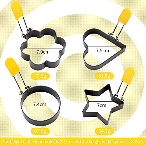 4x Stampo per Frittata di Diverse Forme di Anelli per Uova,Stampo per Uova Fritte Antiaderente in Acciaio Inossidabile,Anelli Egg Ring per Uova Fritte con Manici Pieghevoli in Silicone