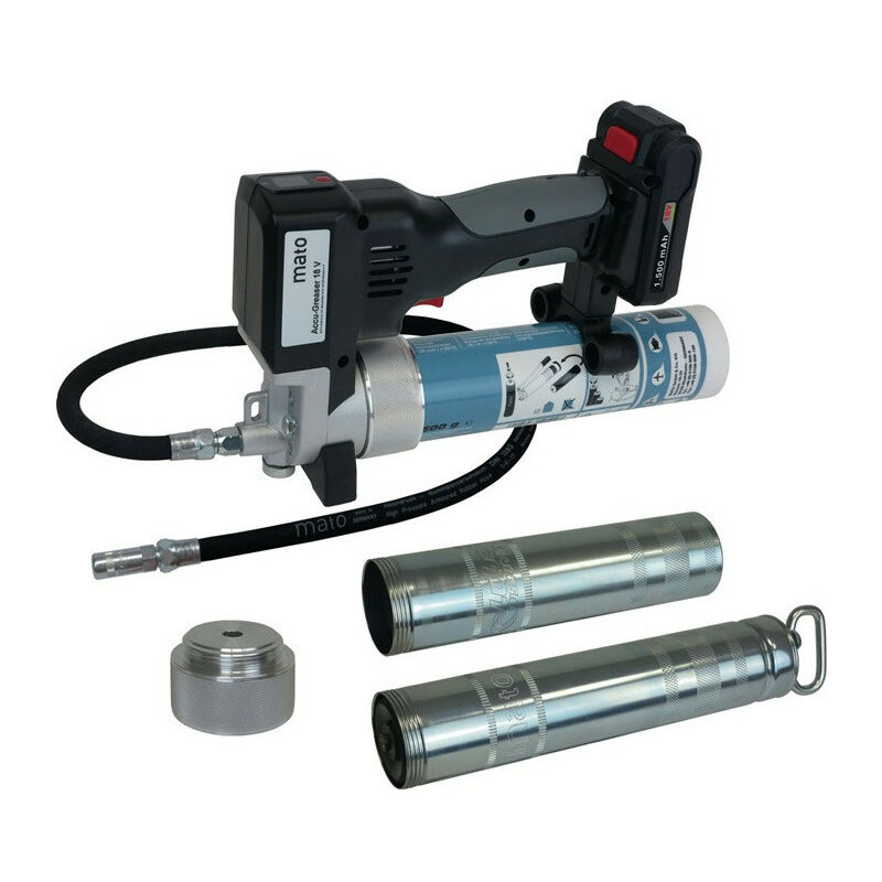18 V Li-ion Display con indicatore batteria e LED per protezione da sovraccarico Batteria Li-ion da 18 V - 1500 mAh Caricabatterie standard con protezione da sovraccarico da 100 a 240 V CA / da 50 a 60 Hz (tempo di ricarica ca. 60 min. ) Massimo.: ca. 115 ccm/min. Serbatoio del grasso per contenere cartucce pull-off da 400 g o grasso sfuso da 500 cc Tubo protettivo per cartucce Lube-Shuttle® da 400 g Adattatore cartuccia per cartucce spin-on da 500 g Attacco di riempimento/scarico Tappo di sfiato Tubo metallico in gomma ad alta pressione (pressione di scoppio 1.650 bar) 750 mm Con pinza idraulica a 4 griffe R1/8 pollici Custodia in plastica con spazio per batteria di riserva e sostituzione della cartuccia · In caso di utilizzo con cartucce avvitabili (principio del vuoto), sostituire il raccordo di riempimento/sfiato con il tappo! Altri dati tecnici: Versione: 18 V / 1500 mAh