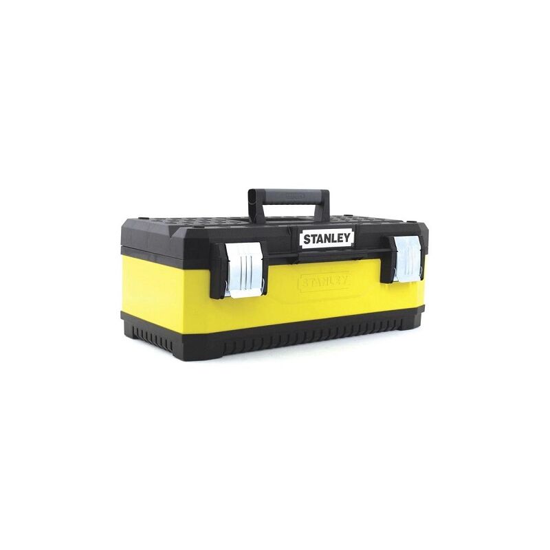 CASSETTA "METAL-PLASTIC" CON VASCHETTA Corpo in metallo molto spazioso. Vaschetta. Coperchio con scanalatura a "V" per il taglio di assi. Grandi cerniere anti ruggine con asola porta lucchetto. Impugnatura ergonomica bi-material. Dimensioni: 66,2 x 29,3 x 22,2