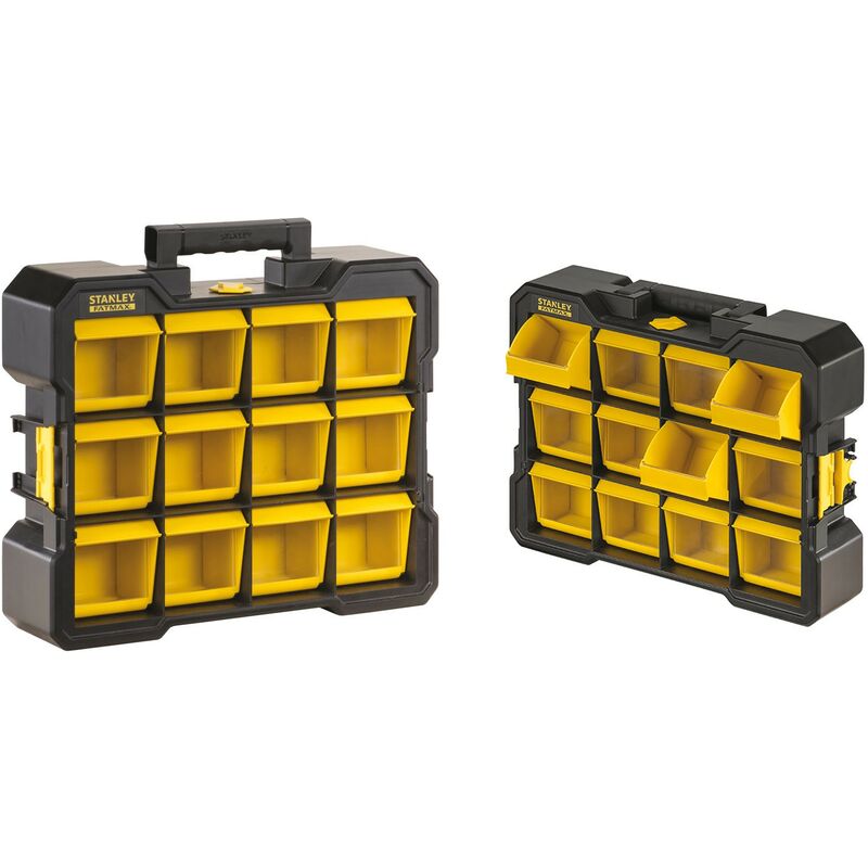 Organizer-Cassettiera portatile con vaschette basculanti 12 vaschette removibili con meccanismo di bloccaggio posto in prossimità dell'impugnatura coperchio in policarbonato trasparente e resistente agli urti cerniere laterali per aggancio di due organizer Capacità max 7 kg Dimensioni 45x35x11 cm