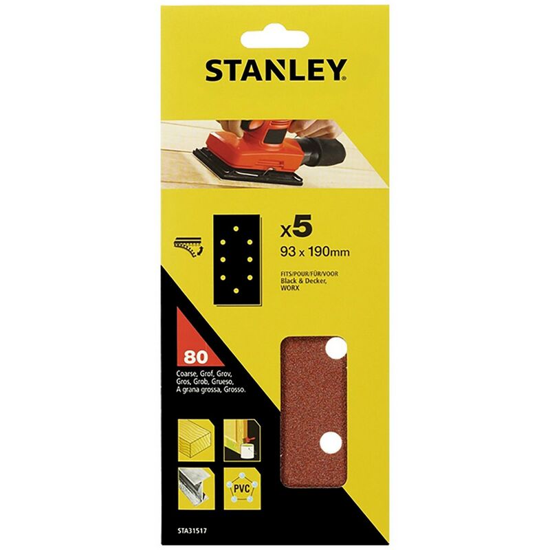 Ideale per levigatura su superfici piane. dimensione mm 93x190, forato, attacco rapido. confezione da 5 pezzi.gr. 120 - black+decker