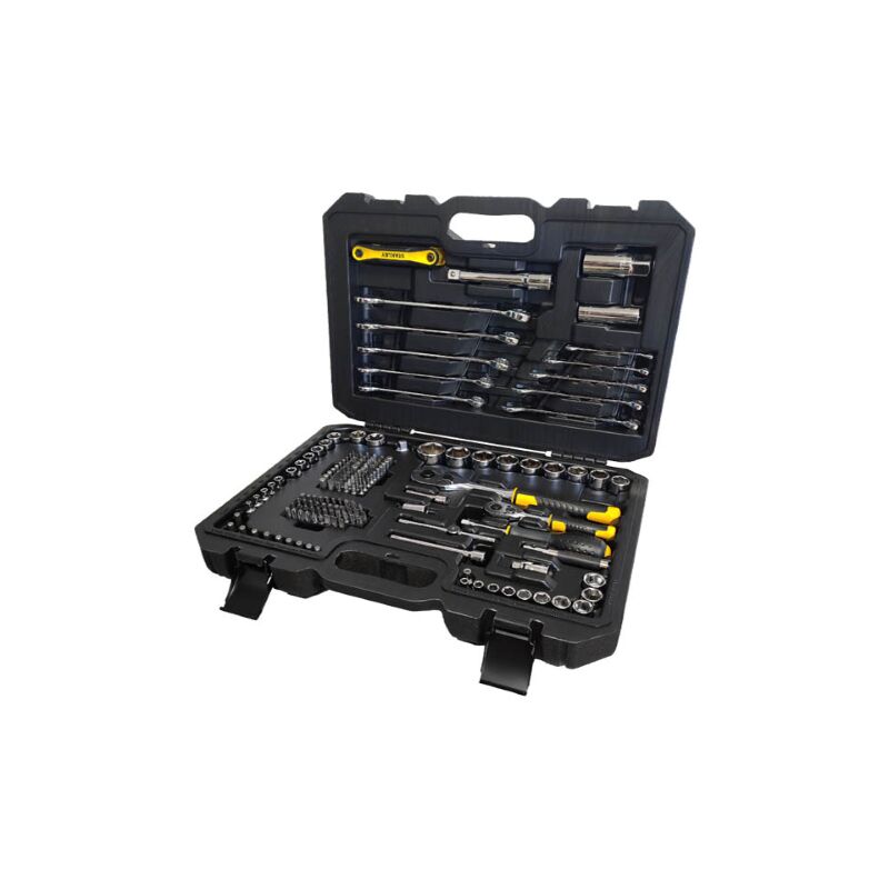 Stanley assortimenti di chiavi a bussola da 1/4 e 1/2 con cricchetto, chiavi combinate e serie di inserti bits in valigetta art.STMT17380-1. Valigetta in materiale sintetico con chiusure metalliche. Set composto da: 9 bussole esagonali con attacco 1/2 da 15 - 16 - 17 - 19 - 20 - 21 - 22 - 24 - 27 mm. 1 cricchetto con attacco da 1/2. 1 bussola per candele con attacco 1/2 da 21 mm. 1 bussola per candele con attacco 1/2 da 16 mm. 1 prolunga con attacco da 1/2 da 250 mm. 2 bussole esagonali con attacco 1/2 da E20 - E22 mm. 6 bussole esagonali con attacco 3/8 da E10 - E11 - E12 - E14 - E16 - E18. 10 bussole esagonali con attacco bits 1/4 da 5 - 5,5 - 6 - 7 - 8 - 9 - 10 - 11 - 12 - 13 mm. 1 riduzione da 1/2 femmina a 3/8 maschio 1 cricchetto con attacco da 1/4. 1 impugnatura porta bussole con attacco da 1/4. 101 inserti bits (Phillips, Pozidriv, Tamper Torx, Esagonali, Standard, Torx). 1 prolunga con attacco da 1/4 da 50 mm. 1 prolunga con attacco da 1/4 da 100 mm. 11 bussole esagonali con