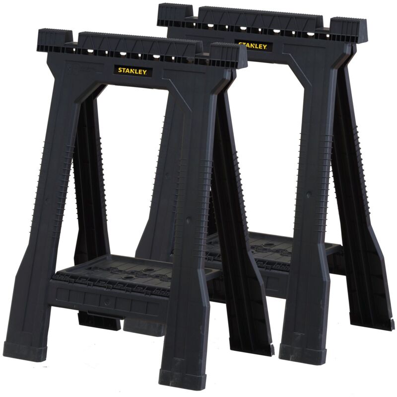 Leggeri e poco ingombranti, sono un valido supporto per molti lavori, pratici da trasportare. Base d'appoggio con scanalature per il taglio di assi. Ripiano. Piedini in gomma antiscivolo. Capacità di carico kg. 362 (la coppia). Dimensioni cm 57,1x6,3x81,1 cm.