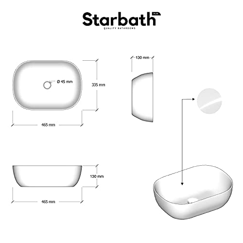 DIMENSIONE IDEALE: Questo lavabo in ceramica STARBATH PLUS hala dimensione ideale che si adatta allo spazio giusto e dà un toccoestetico al bagno. Dimensioni: 46 x 33 x 13 cm (larghezza - profondità- altezza). Il foro di scarico di questo lavabo è di 45 mm, quindi il forodel mobile o del piano di lavoro dovrebbe essere un po' più grande.