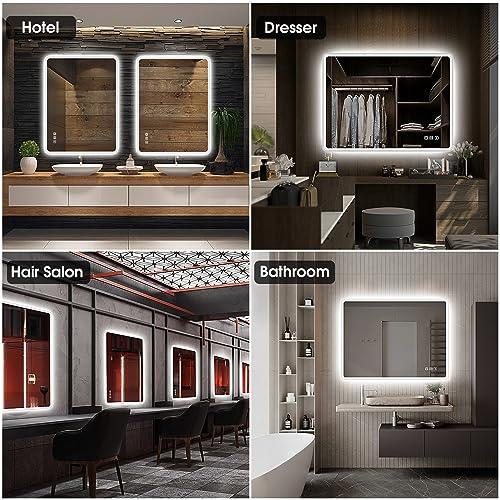 【Impermeabile & Touch】 La striscia LED è impermeabile fino a IP65 e lo specchio è impermeabile fino a IP44 per l'uso in bagni umidi. 3 pulsanti a sfioramento individuali. Il pulsante a sfioramento sul lato sinistro della superficie di vetro controlla l'accensione e lo spegnimento della luce dello specchio, la regolazione della luminosità e la modifica della temperatura del colore. Il pulsante centrale controlla lo sbrinamento e quello destro il Bluetooth.