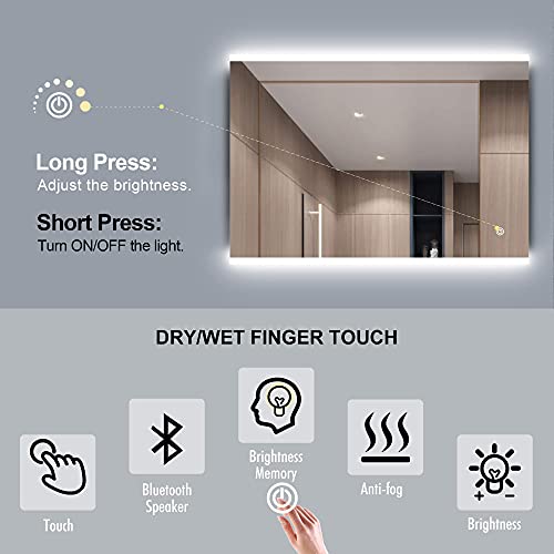 Funzione dimmer e memoria: questa lampada a specchio a LED è dimmerabile e controllata dall'interruttore touch. Basta premere l'interruttore touch per più di 3 secondi per regolare la luminosità della luce. Inoltre, lo specchio ha funzione di memoria. Quando l'alimentazione è spenta, verrà ricordata l'impostazione della luce. Quando la seconda volta che lo usi, tornerà all'impostazione precedente.
