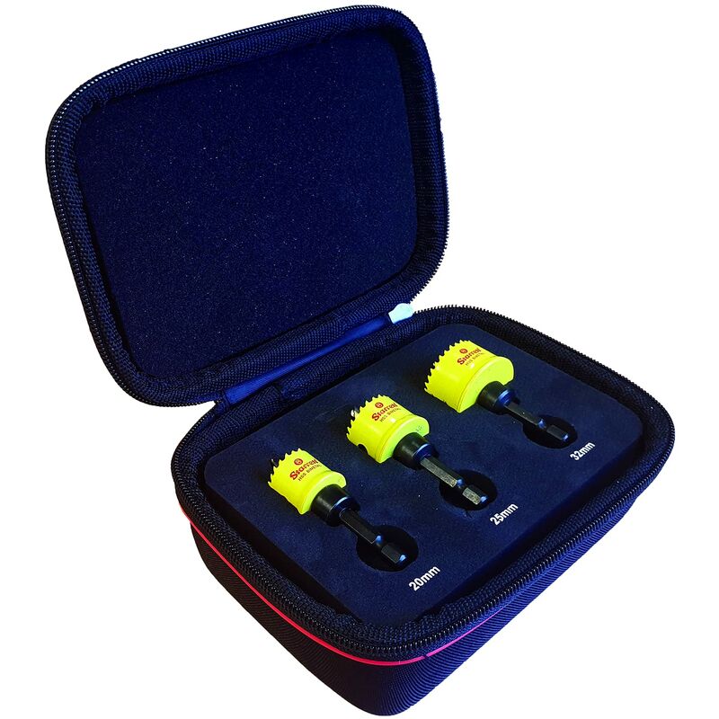 Strumento ideale per tagliare, inossidabile e lamiera di acciaio dolce, Trunking, plastiche legno sottile e sottile. Collare di arresto di sicurezza alla base della sega a tazza da viaggio impedisce oltre la sega a tazza profondità. Completamente assemblato pronto per l' uso. Contenuto: 20, 25 & 32 mm seghe a tazza
