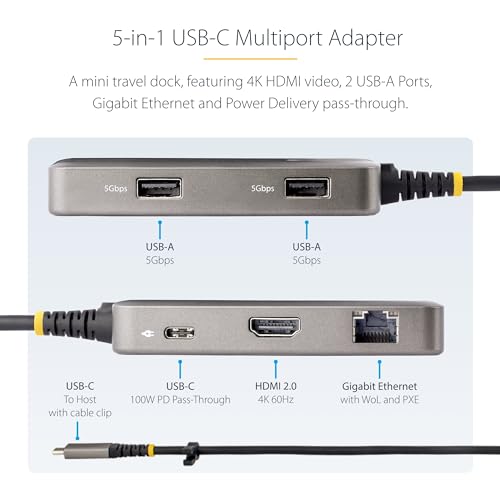 StarTech.com Adattatore Multiporta USB-C - Docking Station USB Type C HDMI 4K 60Hz - Hub a 2 Porte USB 3.0 5 Gbps - 100W PD - GbE - USB Tipo C Mini Dock, Windows/macOS/ChromeOS (103B-USBC-MULTIPORT)