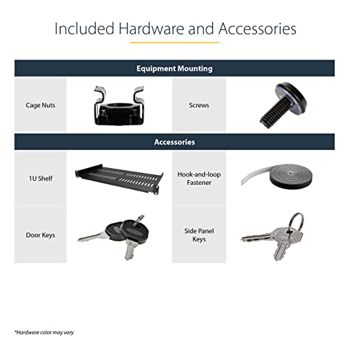 ACCESSORI INCLUSI: Questo Armadio Rack include un set completo di accessori: un Ripiano (CABSHELFV1U), un rotolo fascette a strappo, 50 Viti e Dadi a Gabbia, 2 coppie di chiavi per i pannelli frontali e laterali