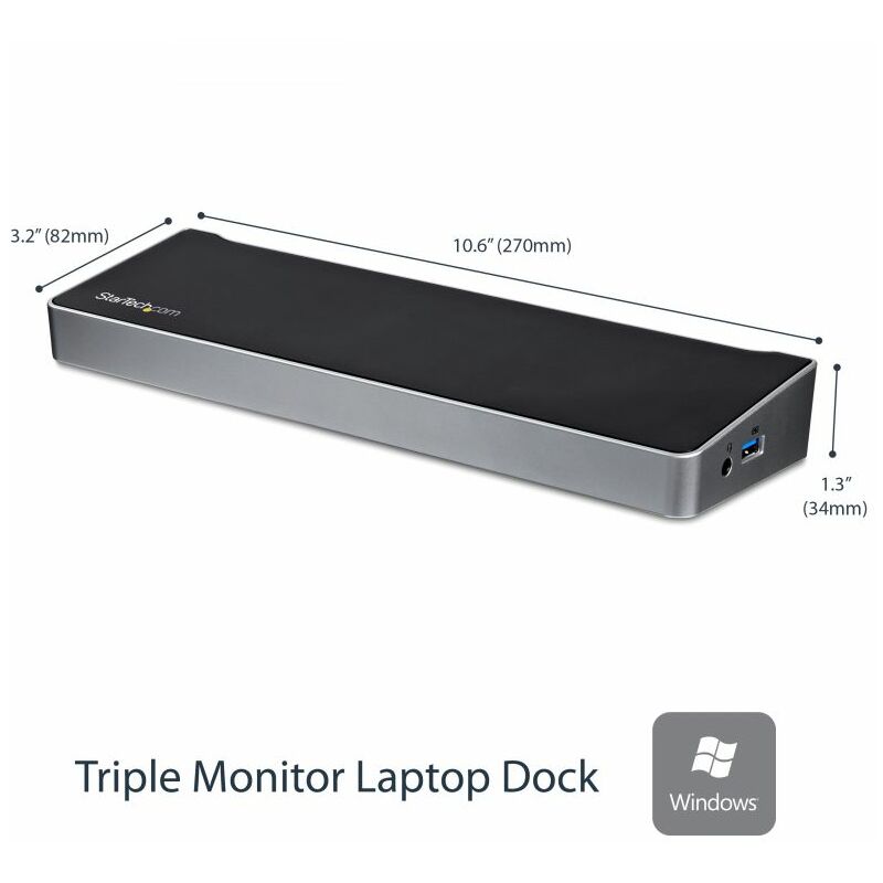 StarTech.com Docking Station replicatore di porte Universale per 3 portatili - video triplo - USB 3.0. Tecnologia di connessione: Cablato, Interfaccia host: USB 3.2 Gen 1 (3.1 Gen 1) Type-A, Connessione cuffia: 3,5 mm. Velocità trasferimento Ethernet LAN: 10,100,1000 Mbit/s, Standard di rete: IEEE 802.3,IEEE 802.3ab,IEEE 802.3u. Colore del prodotto: Nero, Argento, Velocità di trasferimento dati: 5 Gbit/s, Risoluzione (digitale massima): 3840 x 2160 Pixel. Tensione di ingresso AC: 100-240 V, Corrente d'ingresso: 1.5 A, Voltaggio di uscita: 5 V. Sistema operativo Windows supportato: Windows 10,Windows 10 Education,Windows 10 Education x64,Windows 10 Enterprise,Windows 10..., Compatibilità sistema operativo Mac: Mac OS X 10.11 El Capitan,Mac OS X 10.12 Sierra,Mac OS X 10.14 Mojave, Altri sistemi operativi supportati: Cromo