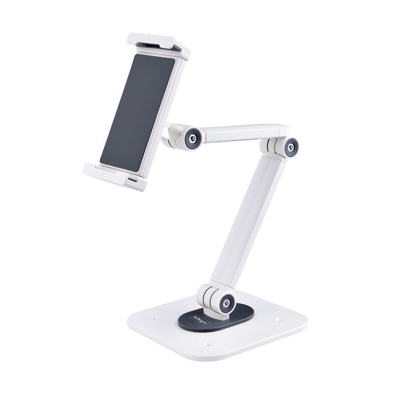 Struttura in Acciaio e Alluminio | Montaggio su Scrivania o a Parete | ErgonomicoQuesto supporto per tablet ergonomico e regolabile consente di integrare senza problemi un tablet in una workstation. La posizione del tablet all'interno del morsetto può essere modificata in base alle esigenze di visualizzazione dell'utente. Il leggio per tablet è dotato di cuscinetti antiscivolo sul morsetto e sotto la base per proteggere il dispositivo e il piano di appoggio. La base può essere fissata su una scrivania utilizzando le viti per legno 4,2x19 mm incluse. Il morsetto supporta tablet con larghezza compresa tra 12,7-22,7 cm cm, spessore di 1 cm e con peso massimo di 1 kg. Il supporto per tablet viene spedito completamente assemblato per una rapida implementazione in ambienti rivolti ai cliente e in applicazioni Point-of-Sale.Regola l'Angolo di VisualizzazioneIl braccio snodato consente di regolare l'altezza fino a 47 cm dalla base e di regolare l'angolo di visione. Il giunto sferico