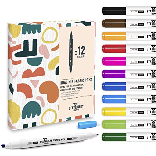 STATIONERY ISLAND Pennarelli per Tessuti e Stoffa 12 Colori - Pennarelli Indelebili Punta Fine. Pennarelli Indelebile a Doppia Punta ai Lavaggi. Per Tessuti (Magliette, Jeans, Borse e Tele)