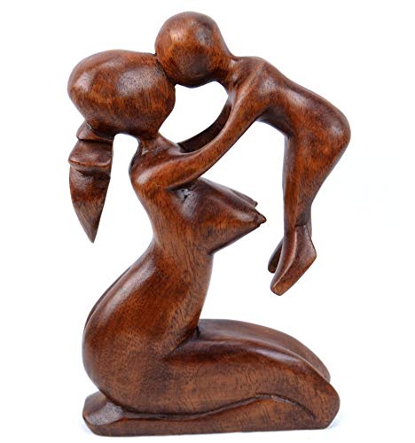 Statua Astratta mamma e bambino H20 cm in legno massiccio colore cioccolato intagliato mano