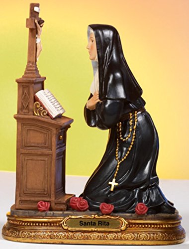 Statua Santa Rita inginocchiata su altare in resina da 17 cm
