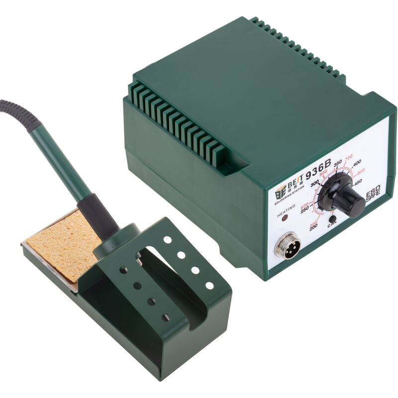 Stazione di saldatura della MIGLIORE marca (modello BST-936B). Stazione per il soldatino di latta. Il saldatore consente di collegare i componenti elettronici tra loro con precisione. Ideale per riparare circuiti stampati con tecnologia SMD e tutti i tipi di componenti elettronici. Specifiche Stazione di saldatura a stagno da 45 W. Funzione temperatura saldatore regolabile da 200 ° C a 480 ° C tramite potenziometro. Include il supporto per il saldatore a stagno con spugna pulente. Punte intercambiabili per saldatore. Ha un LED indicatore di stato. Lunghezza cavo saldatore: 1 m. Tensione di uscita 24 VAC. Tensione di ingresso 110/220 VAC.