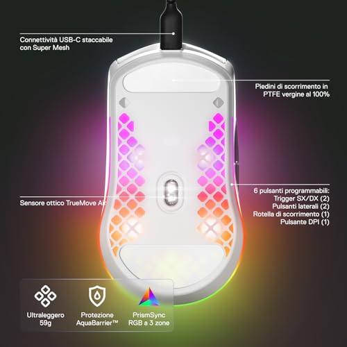 SteelSeries Aerox 3 - Mouse da gioco RGB traforato - Design ultraleggero e resistente all'acqua - Sensore ottico TrueMove Core da 8.500 DPI - Snow