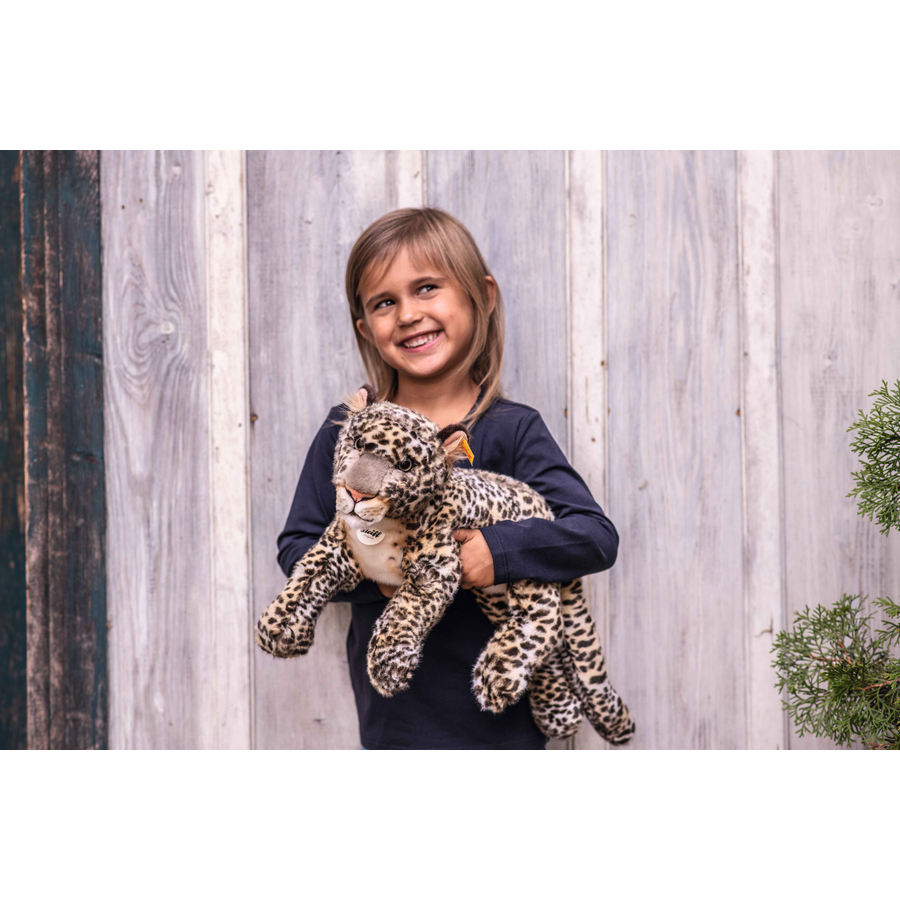 Dettagli del prodotto: Età: da 3 anni Con pulsante nell'orecchio in acciaio inossidabile Con bellissimi occhi verdi di plastica Morbido peluche Beige/marrone maculato Dimensioni e peso: Dimensioni da assemblato (lunghezza x larghezza x altezza): 36 x 25 x 18 cm. Peso: 0,28 kg Materiale e cura: Materiale: 84% acrilico, 16% poliestere, imbottitura in materiale sintetico. Istruzioni per la cura: lavabile in lavatrice a 30°C, non candeggiare, non asciugare in asciugatrice, non stirare, non lavare a secco.
