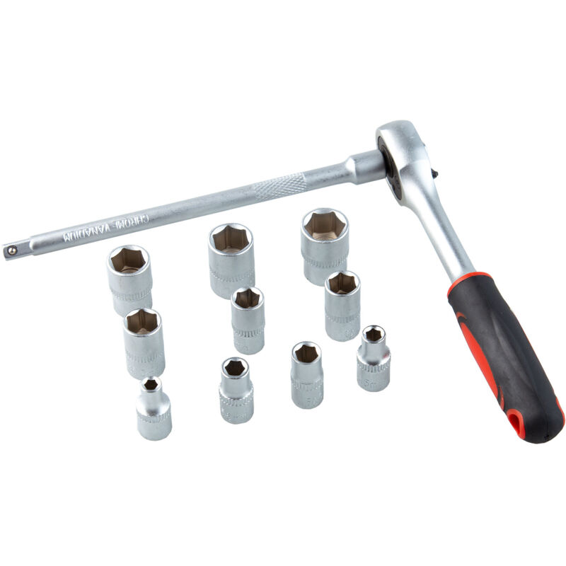 Set di chiavi a bussola esagonali da 1/4. In acciaio al cromo vanadio. Finitura fosfatata resistente alla corrosione. 10 bussole (1/4) da 4 mm a 13 mm. Chiave a cricchetto da 1/4 e barra di prolunga da 6. Presentato in blister appendiabiti. li>