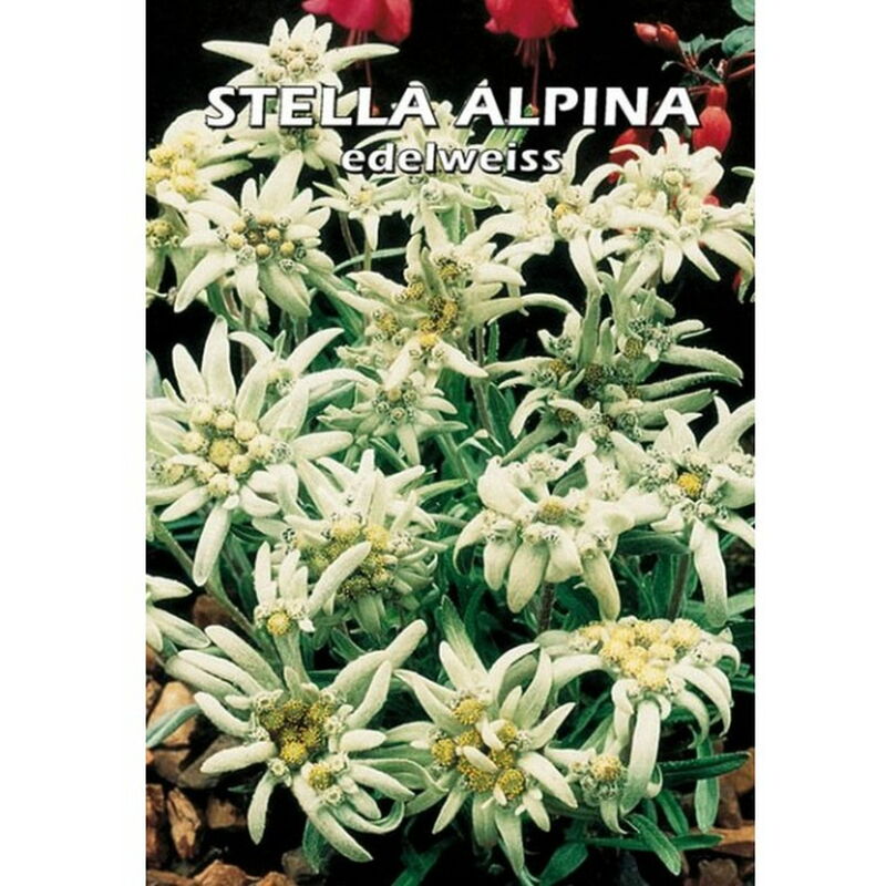 Stella alpina (Edelweiss), pianta perenne alta 20 cm, che produce foglie grigio-verdi, disposte a rosetta e numerosi capolini con fiori di colore bianco, che donano all'infiorescenza l'aspetto di un unico fiore. Ideale per giardini rocciosi, alpini, muri a secco e selciati. Bustina termosaldata