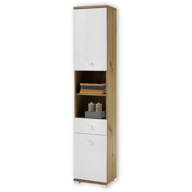 Il mobile da bagno colpisce per il suo look accattivante. Con i suoi singoli scomparti, il cassetto e i due scomparti aperti, l'armadio alto offre abbastanza spazio per i vostri asciugamani e utensili da bagno. Grazie alle istruzioni dettagliate, l'armadio alto è facile e veloce da montare ed è quindi adatto anche ai principianti. Consegna: 1x armadio alto