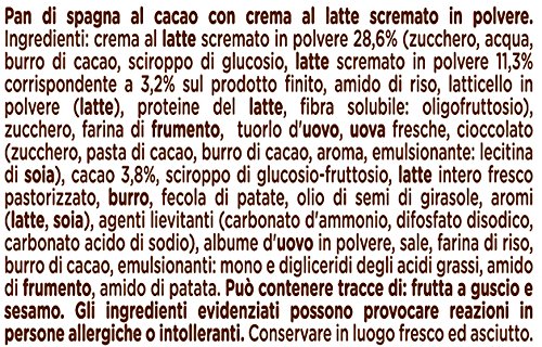 INGREDIENTI - Pan di spagna al cacao con crema al latte scremato in polvere, zucchero, uova fresche, cioccolato;