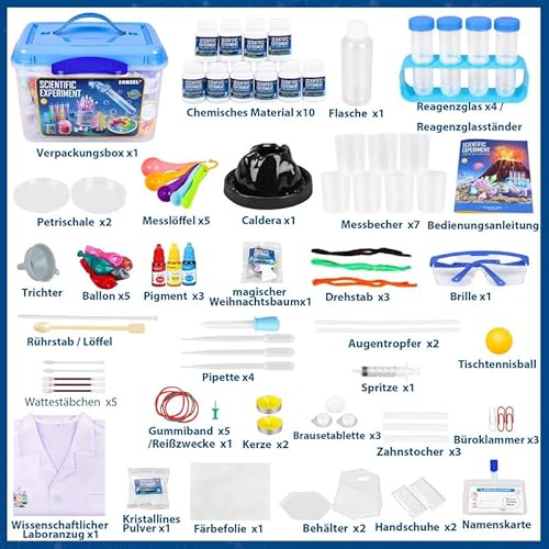 Confezione: il set contiene 1 imbuto, 1 paio di occhiali di protezione, 10 materiali chimici, 2 ciotole di Petri, 1 pallina da ping pong, 3 pigmenti, 2 compresse effervescenti, 7 misurini, 4 provette, 2 guanti, 4 elastici, 4 contagocce, 2 cannucce, 3 stuzzicadenti, 3 spilloni, 5 misurini. cucchiaio, 5x palloncini, 3 barre di torsione, 2 bastoncini per mescolare, 1 albero di Natale, ecc.