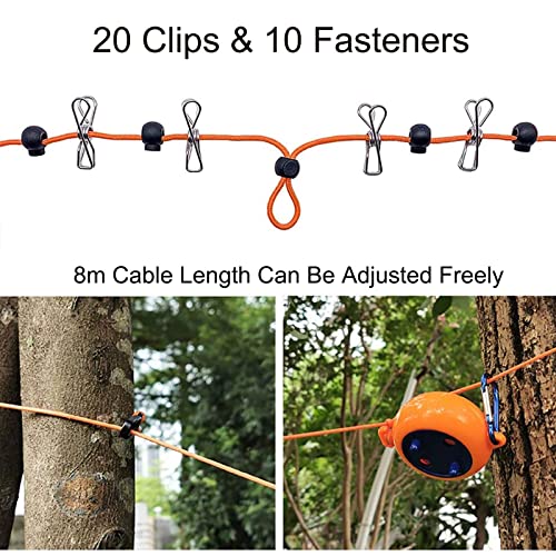 【Antiscivolo e antivento】 La linea di abbigliamento è dotata di 10 fibbie fisse e 20 clip antivento. Le fibbie fisse possono fissare la distanza tra i vestiti e risparmiare tempo per asciugare i vestiti. La clip antivento può bloccare i vestiti per garantire che i vestiti non cadano dallo stendibiancheria.