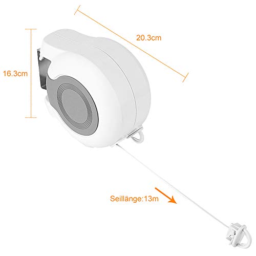 【Stendibiancheria telescopica】 Questo stendibiancheria retrattile da esterno ha le caratteristiche di flessibilit . Il filo da bucato telescopico pu estendersi fino a 13 metri. Puoi regolare la lunghezza della corda da bucato in base alla larghezza della tua parete o al numero di vestiti per formare uno spazio di asciugatura pi¹ grande. Quando non in uso, la linea di produzione verr ritratta nella bobina per rendere il tuo spazio pi¹ ordinato