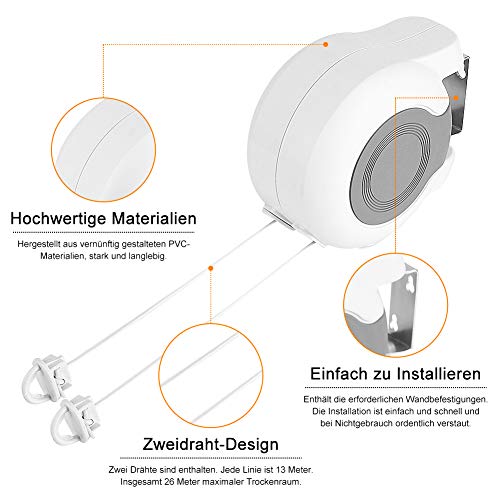 【Design a due linee】 La doppia linea di lavaggio retrattile da 42,65 piedi adotta un design a due linee, ogni linea lunga 42,65 piedi e lo spazio di asciugatura massimo 85,3 piedi in totale. Puoi appendere pi¹ oggetti in uno spazio limitato, che molto adatto a singoli o famiglie numerose. Che si tratti di appendere vestiti asciutti o bagnati, adatto per uso interno ed esterno