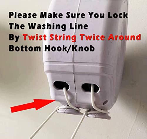 Stendibiancheria retrattile da parete da 26 m, filo stendibiancheria retrattile stente, stendibiancheria estensibile stendibiancheria regolabile per giardino all'aperto o interno. Per il blocco, si prega di assicurarsi di bloccare la linea di lavaggio ruotando la corda intorno al gancio inferiore.