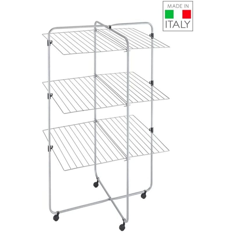 Stendibiancheria verticale a tre piani, dotato di 3 griglie ripiegabili e ben 40 metri di stenditura. ideale per spazi ridotti, grazie alla sua speciale struttura potrai sfruttarlo anche a mezza apertura.