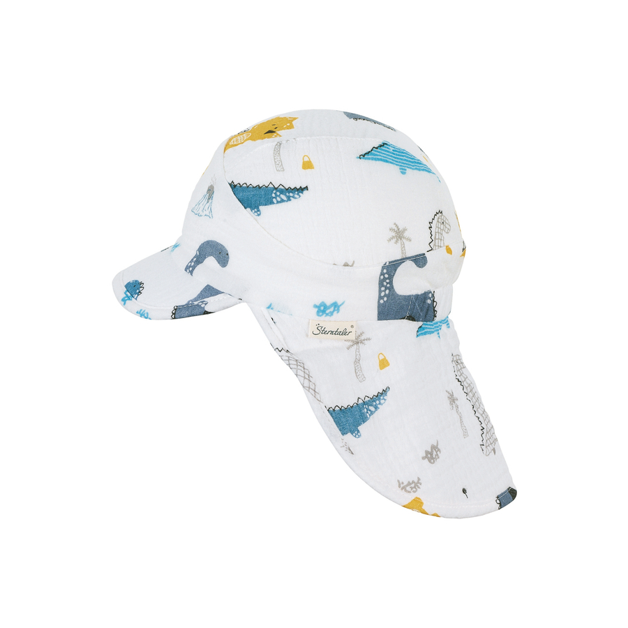 Dettagli del prodotto: Berretto con protezione per il collo in mussola di cotone (biologico). Stampato con dinosauri Foderato con mussola di cotone (bio) Materiale e cura: Materiale: 100 % cotone (biologico) Lavabile a 30° C Non adatto all'asciugatrice Non lavare a secco Non candeggiare