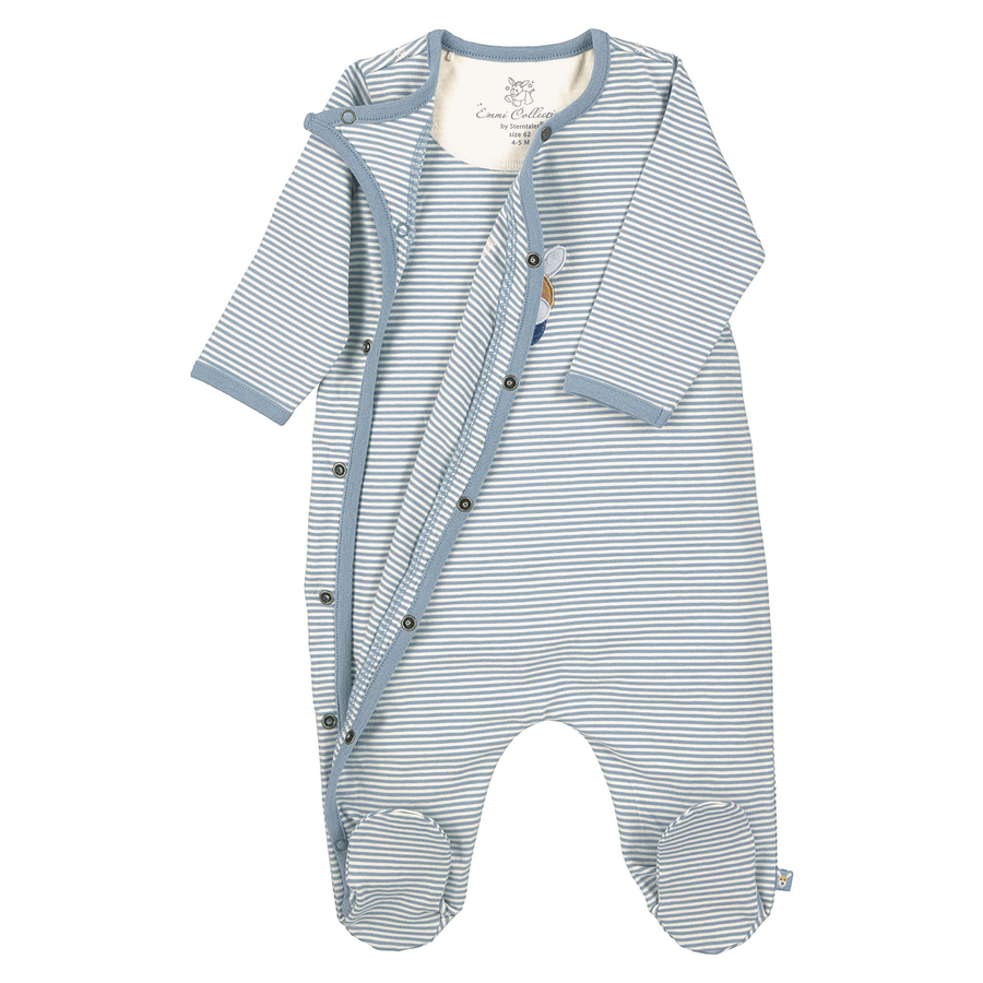 Dettagli del prodotto: Tutina GOTS - pezzo unico con piede in look avvolgente. Abbottonato sul davanti Realizzato in pregiato jersey a righe Single Fronte con piccola applicazione Emmi Numero di test GOTS: BCS 35119 Materiale e cura: Materiale: 95 % cotone (biologico), 5 % elastan Lavabile fino a 40° C Non adatto all'asciugatrice Non lavare a secco Non candeggiare