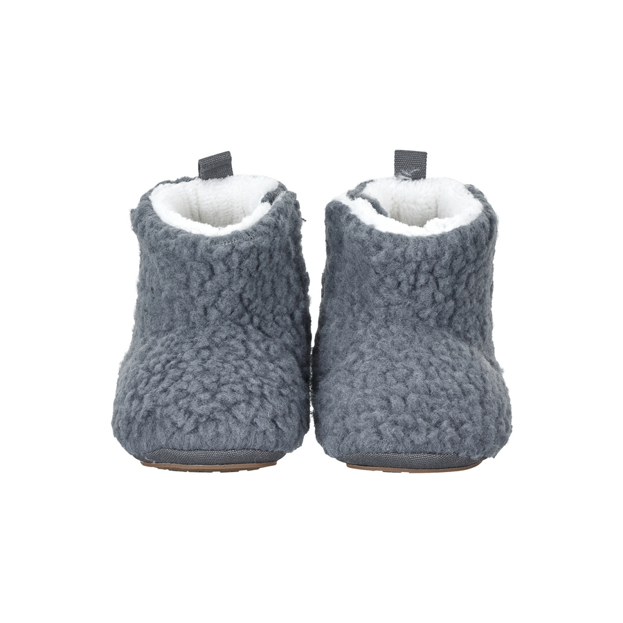 Dettagli del prodotto: Scarpina per bebè in bouclé di pile con punte di dinosauro. Con chiusura a velcro e suola a stella antiscivolo cucita/li>