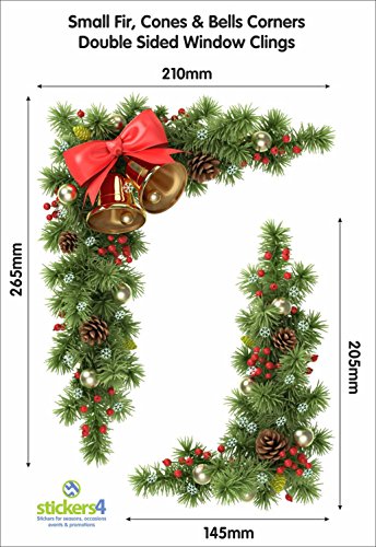 Sticker4, decorazione natalizia angolare per finestra raffigurante conifere, pigne, campanelle, Vinile, Small (Set of 2 Corners)