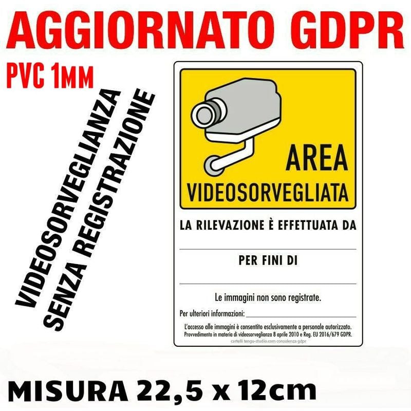 N° 2 adesivi 22,5 x 15 cm realizzati su PVC plastificato Aggiornato GDPR UE 2016/679. Obbligatori da esporre in presenza di telecamere, come previsto dalla legge. Resistenti all'acqua, intemperie e ai graffi, adatti per interni e esterni. Efficace per proteggere la tua proprietà e la tua sicurezza personale . Ottimi per scoraggiare malintenzionati e avvisarli della presenza di tecnologie di localizzazione. Resistenti al calore e ai raggi UV. I cartelli sono realizzati con tecnica solvente su supporto in PVC di alta qualità e protetti con un film trasparente per una maggiore resistenza. S presentano come un foglio bianco con scritta nera, di facile applicazione su una superficie pulita e asciutta, fondamentali per allontanare i malintenzionati, proteggere i tuoi beni e la tua sicurezza personale! Il prezzo si riferisce a n° 2 cartelli. I vecchi cartelli di videosorveglianza sono ancora validi? I vecchi cartelli in circolazione fanno riferimento all?articolo 13 del D.Lgs 196/2003