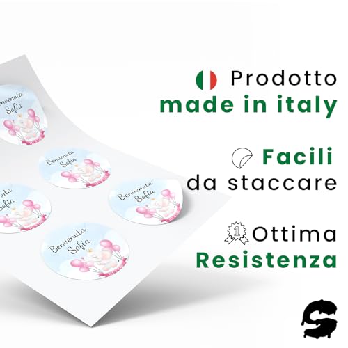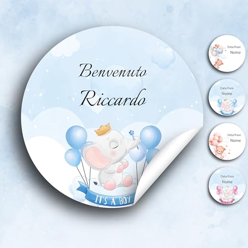 Stickyattack 50 TAG ADESIVI PERSONALIZZATI BATTESIMO con NOME e DATA di Nascita per Bomboniere e Inviti, Etichette Adesive Personalizzate per Battesimi, Adesivi Battesimo Made in Italy (Elefante Blu)