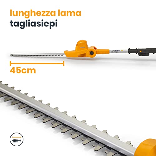 Versatile attrezzo multifunzione a batteria con accessorio tagliasiepi (150 W) e braccio potatore (280 W), Prolunga telescopica per raggiungere siepi e rami più alti senza scala, Adatto a lavori semplici e veloci