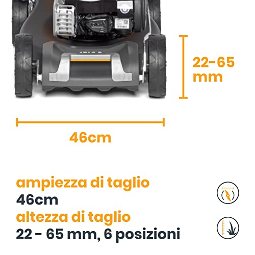 Altezza di taglio regolabile in 6 posizioni da 22 a 65 mm tramite un'apposita maniglia, Larghezza taglio di 46 cm, Motore a scoppio da 1750 W