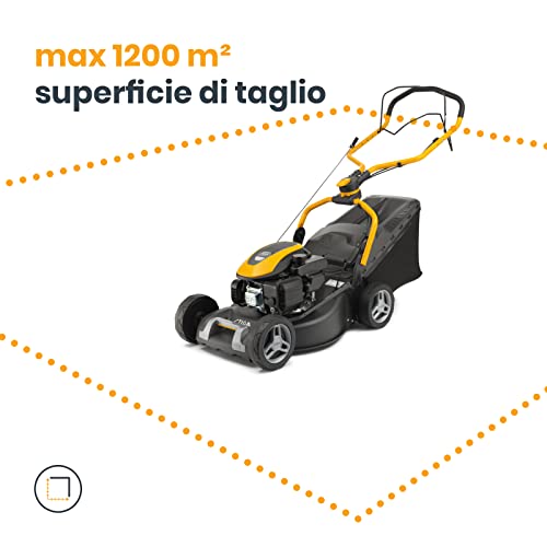 Motore a scoppio STIGA da 123 cc, Potenza 1900 W, Avviamento a strappo, Scocca in acciaio, Ruote 20/20 cm con battistrada morbido, Sacco di raccolta ibrido da 60 L con indicatore di riempimento