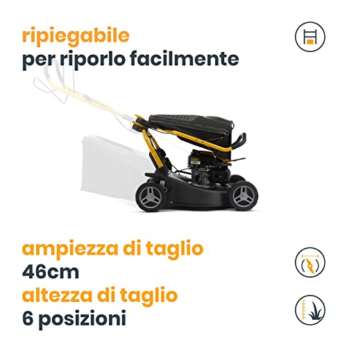 Larghezza di taglio di 46 cm, Due modalità di taglio disponibili (raccolta e scarico posteriore), Altezza di taglio regolabile in 6 posizioni (22-65 mm) tramite una maniglia