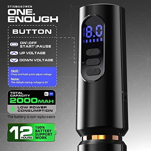 STIGMA OWEN: Batteria 2000 mAh, macchina a basso consumo energetico, una carica completa può supportare 12 ore di lavoro. Visualizzazione della potenza: nella parte inferiore dello schermo sono presenti 5 griglie, che rappresentano il 20%, 40%, 60%, 80% e 100% della potenza rimanente.