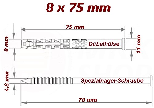 Stile Tasselli con tasselli con lembi Perre einschlag tasselli vormontiert Cilindro Testa a testa svasata in molte misure zincato a croce vite tasselli nylon durchsteck montaggio, Menge: 100 Stück, 8x75 mm