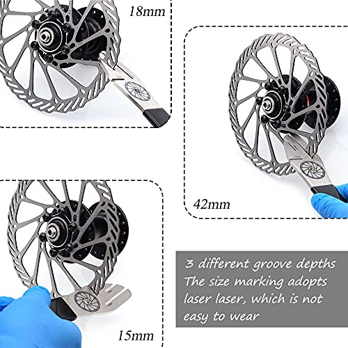 Tre dimensioni della profondità della scanalatura: il nostro ravvivatore per freno a disco per bicicletta ha 3 diverse profondità della scanalatura (15 mm / 18 mm / 42 mm), che possono essere utilizzate per regolare il freno a disco da diverse angolazioni per assicurarti di completare il lavoro in modo efficiente e professionale. Il segno di misura sulla chiave adotta il laser laser, che non è facile da indossare e ha un alto grado di riconoscimento. (Larghezza delle fessure circa 2,5 mm)