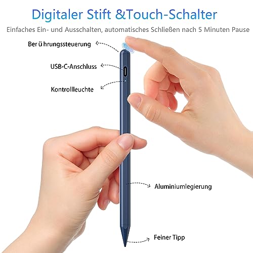 Modalità super bassa: grazie alla tecnologia di gestione dell'alimentazione ad alta tecnologia, il dispositivo si spegne automaticamente dopo 5 minuti di inattività. Ciò consente di risparmiare energia e prolunga enormemente la durata del dispositivo. La penna per iPad con cavo ricaricabile di tipo c supporta una durata di funzionamento continuo da 15 a 20 ore e un tempo di ricarica da 80 a 120 minuti.