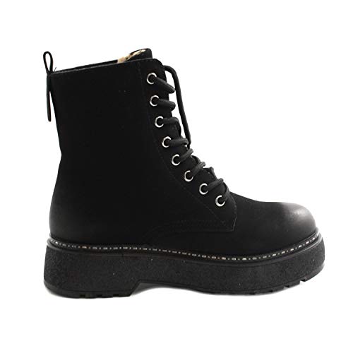 Stivaletti Anfibi Donna Cafe'Noir in camoscio Nero, Stringati con Piccole Borchie in Punta. Fondo in Gomma Glitterata e Antiscivolo. N.38