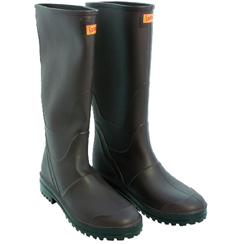 In PVC e gomma nitrilica. Con fodera in tessuto di cotone, suola carrarmato. N. 40 - colore marrone